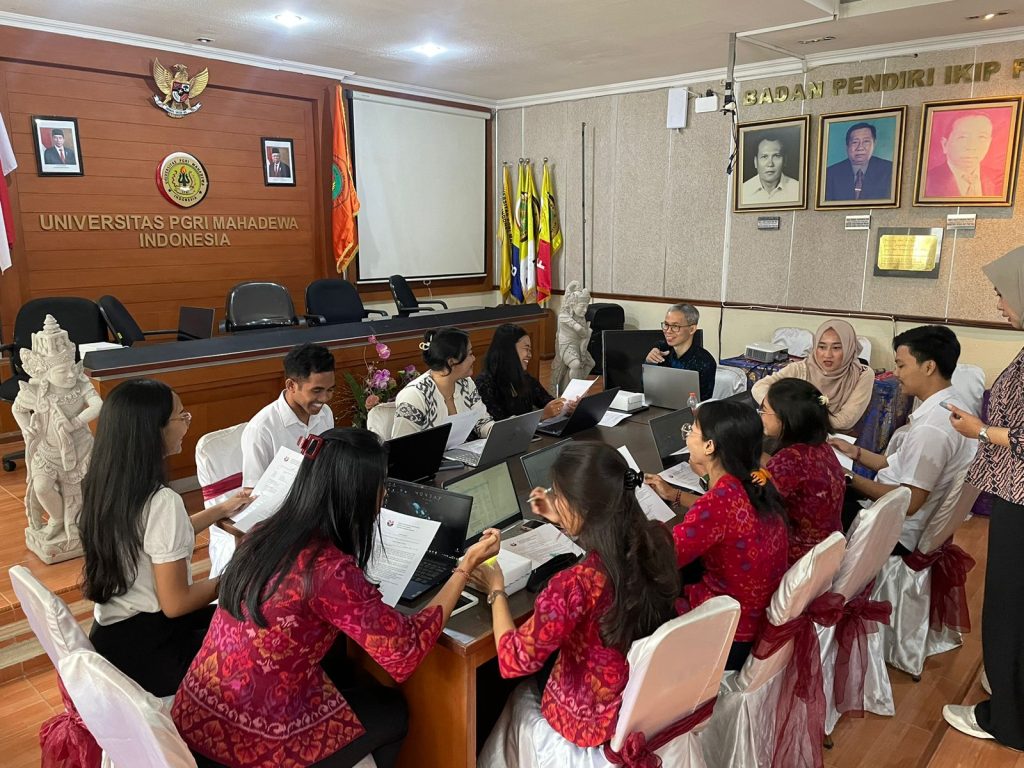 Kegiatan ini dilaksanakan secara luring di gedung Paseban Universitas PGRI Mahadewa Indonesia (UPMI) dengan mengambil tema “Pengembangan Pedagogik Pendidikan Guru untuk Penguatan Identitas Profesional: Model Inklusif untuk Indonesia yang Beragam”. Aktivitas ini meliputi kegiatan Focus Group Discussion (FGD) dan diskusi naratif terkait tema yang di bahas. Proyek ini diharapkan bertujuan mengidentifikasi ‘critical’ incidents’ yang mempengaruhi alasan mahasiswa memilih profesi guru dan mengeksplorasi sistem keyakinan tentang guru dan mengajar dan bagaimana hal tersebut mempengaruhi perspektif pedagogik yang menjadi rujukan mereka saat ini.